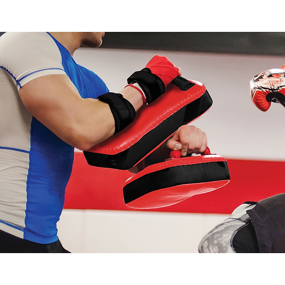 Designed to bring the maximum intensity to your workouts, these black and red pads are sturdy and long-lasting. The pads are built to withstand punishment while providing you with the optimum in comfort and safety. These pads with their dense padding and durable stitching can take a beating! The adjustable strap ensures a secure grip.
