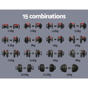 If you are looking to boost those triceps, biceps and shoulders, our 2pcs 24kg Adjustable Dumbbells are the perfect deal for you. Whatever your game is, our dumbbell set lets you strengthen and tone those muscles your way. This commercial-grade set features a high-quality bar with non-slip handle that offers optimal gripping surface. The innovative design allows for 15 combinations of quality incremental weights from 2.5kg to 24kg, to suit your workout requirements. The 10 plastic-coated iron weight plates sit in the dumbbell holder. You can just press down the high-quality steel dumbbell bar onto the weight plates and rotate the weight adjustment dial for the right plates to lock into place. The high-quality star-shaped nuts ensure the weight plates stay securely in place for safe workouts. Gym junkie or workout pro, you can get fit easily with our Adjustable Dumbbell.
