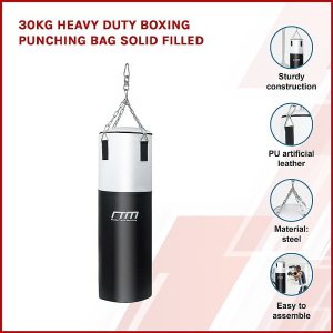 You get a solid filled 30kg punching bag. You get the fixtures you need to hang the punch bag up and start working out immediately. The heavy duty artificial leather will take as much punishment as you can give it.