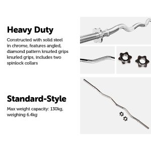 This bar accepts Standard-style weights up to a total capacity of 130kg. The bar itself weighs 6.4kg (14 lbs). Chrome plated and made from solid steel with knurled grips, this bar is built gym-tough. Two spin lock collars are included with your purchase.