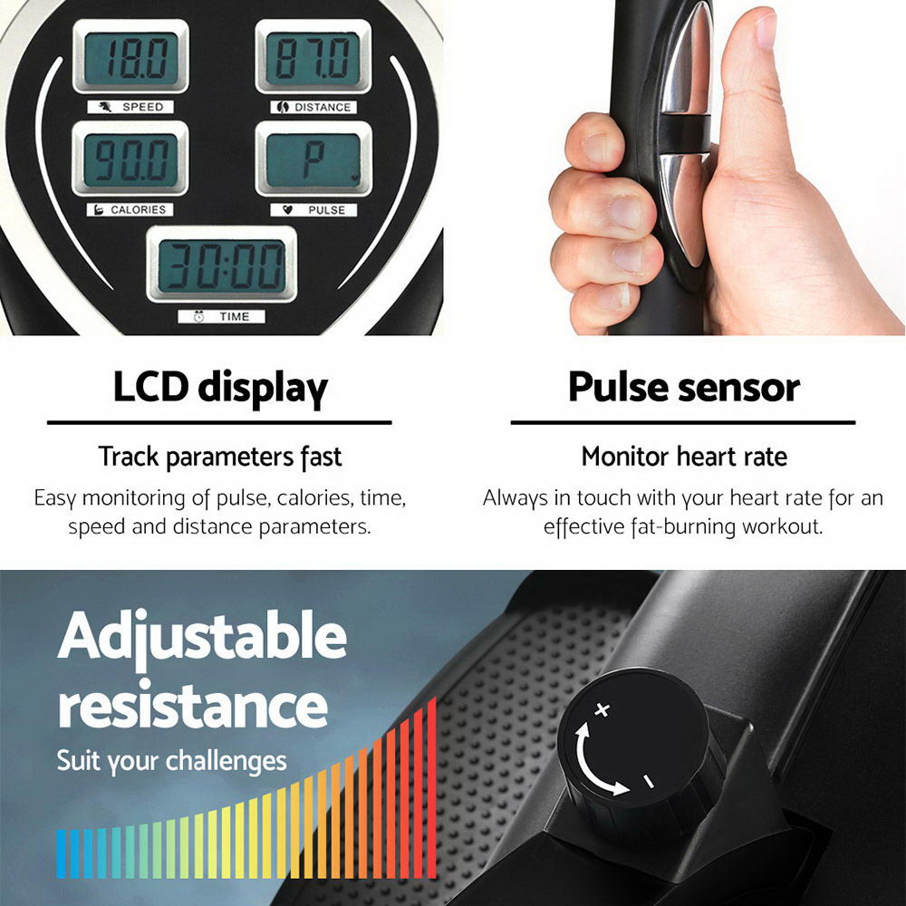 The Everfit Elliptical Cross Trainer boasts a robust industrial-strength powder-coated rust-proof steel frame, supporting up to 120kg weight capacity. Featuring a 280cm stride length, it tracks time, speed, distance, calories burned, and pulse readings with hand pulse sensors. Available in sleek black, it combines durability, functionality, and style seamlessly.