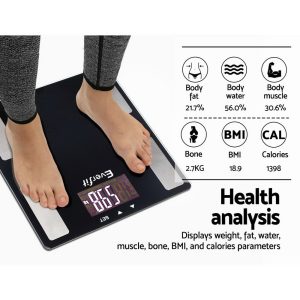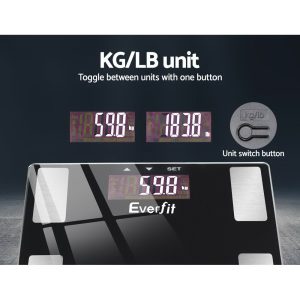 The Everfit digital scale is equipped with a high-precision sensor system, the body fat scale measures up to seven parameters such as weight, water, body fat, bone, calories, BMI and muscle contents. The measurement range handles up to 180kg or 400lbs in accurate 0.1kg/0.2lbs scale division. The scale also has a durable 6mm tempered glass platform. To use the scale, just set up your personal data, select your profile and step onto the scale. The scale will display the results on the large LCD display after each weigh-in and you can store profiles of up to twelve users. With other great features such as low power/overload indication and auto on/off, the Everfit Body Fat Scale makes keeping track of your health fast and easy.