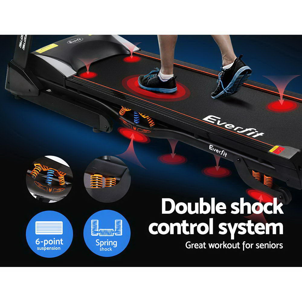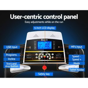 Compact and sturdy with its powder-coated steel frame, the Everfit Electric Treadmill 48cm allows you to perform essential cardio exercises within the comfort of your home. It features 12 pre-set training programs designed to simulate natural terrain. A user-centric control panel with a digital LCD display lets you set up to 18 speed levels and other monitoring parameters. Its linear power drive motor produces smooth and seamless operation and the anti-slip belt and soft-grip handle bar with pulse sensors make your session a comfortable and controlled experience. Other great features include a 15-level inclination adjustment, innovative double shock absorption system, automatic motor and belt lubrication, safety tether key and smooth wheels for easy mobility. Not least, the Treadmill is also equipped with a USB and MP3 connection, speakers, dual drink holders and a tablet holder for those who like to workout in style.