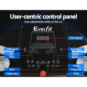 For a truly effective approach to weight loss and toning, our Everfit Electric Treadmill is your perfect companion. Compact and sturdy with its powder-coated steel frame, the treadmill allows you to perform essential cardio exercises within the comfort of your home. It features 12 pre-set training programs designed to simulate natural terrain. A user-centric control panel with a digital LCD display lets you set up to speeds between 1km/h and 12km/h and other monitoring parameters. Its powerful motor produces smooth and seamless operation and the anti-slip belt and soft-grip handlebar with pulse sensors make your session a comfortable and controlled experience.