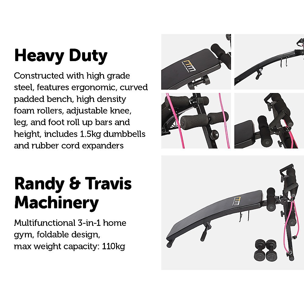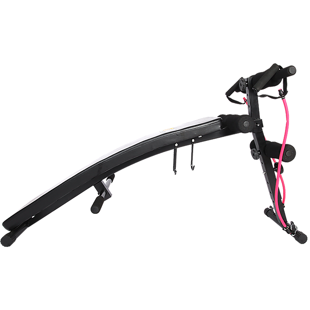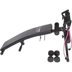 The incline sit-up bench is curved to ensure an intense core and upper body workout. The two 1.5kg dumbbells and pair of rubber cord resistance expanders will bring new strength and tone to your muscles. This must-have sit-up bench adjusts for height to enable maximum intensity and features adjustable knee, leg and foot foam roller bars to accommodate all body sizes.