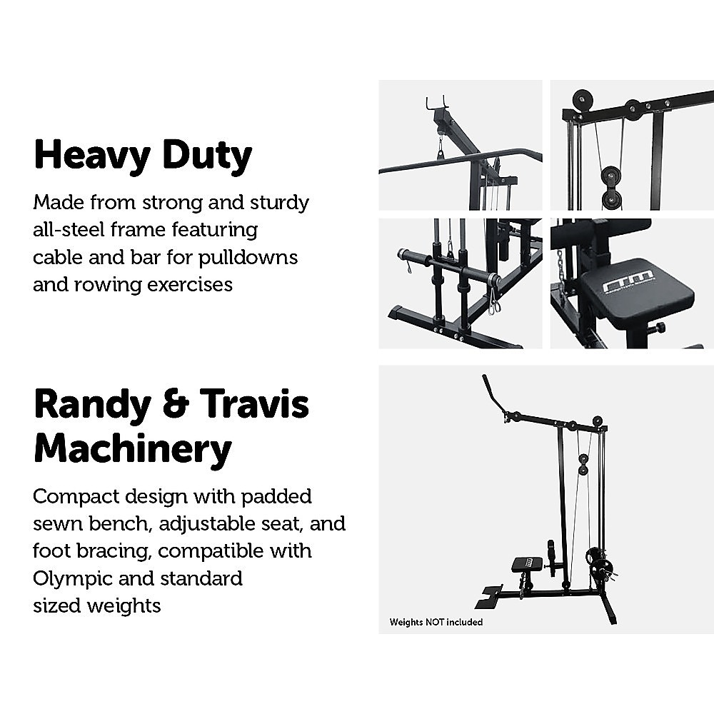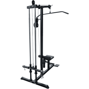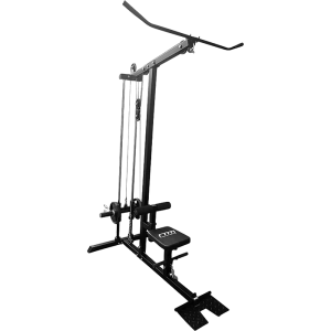 This fitness plate loaded lat pull down/seated row machine has a heavy duty steel construction. The solid unit has a dual guide rod system which provides the ultimate in safe, smooth and easy range of motion. The foot plate can be quickly flipped up in place for seated rows. Lat pull down, straight row bar and standard and Olympic weight plate adapters are included. It’s “no cable change” design allows for easy adjustment.