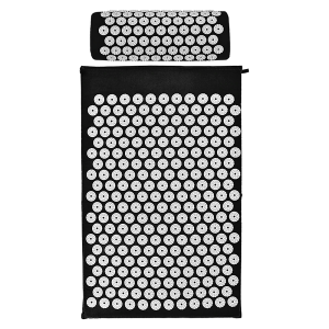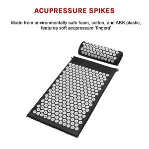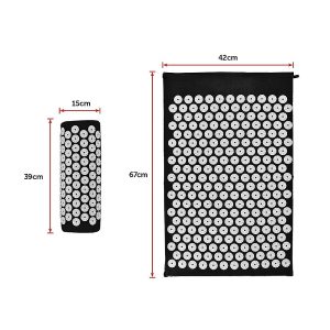 The Acupressure Mat and Pillow set in sleek black offers a multitude of benefits, including stress relief, muscle tension reduction, and enhanced blood circulation. Its ergonomic design targets key areas such as the back, neck, shoulders, and more, providing soothing relief and relaxation. Made from high-quality materials including cotton, ABS plastic, and eco foam, this mat set ensures both comfort and durability.
