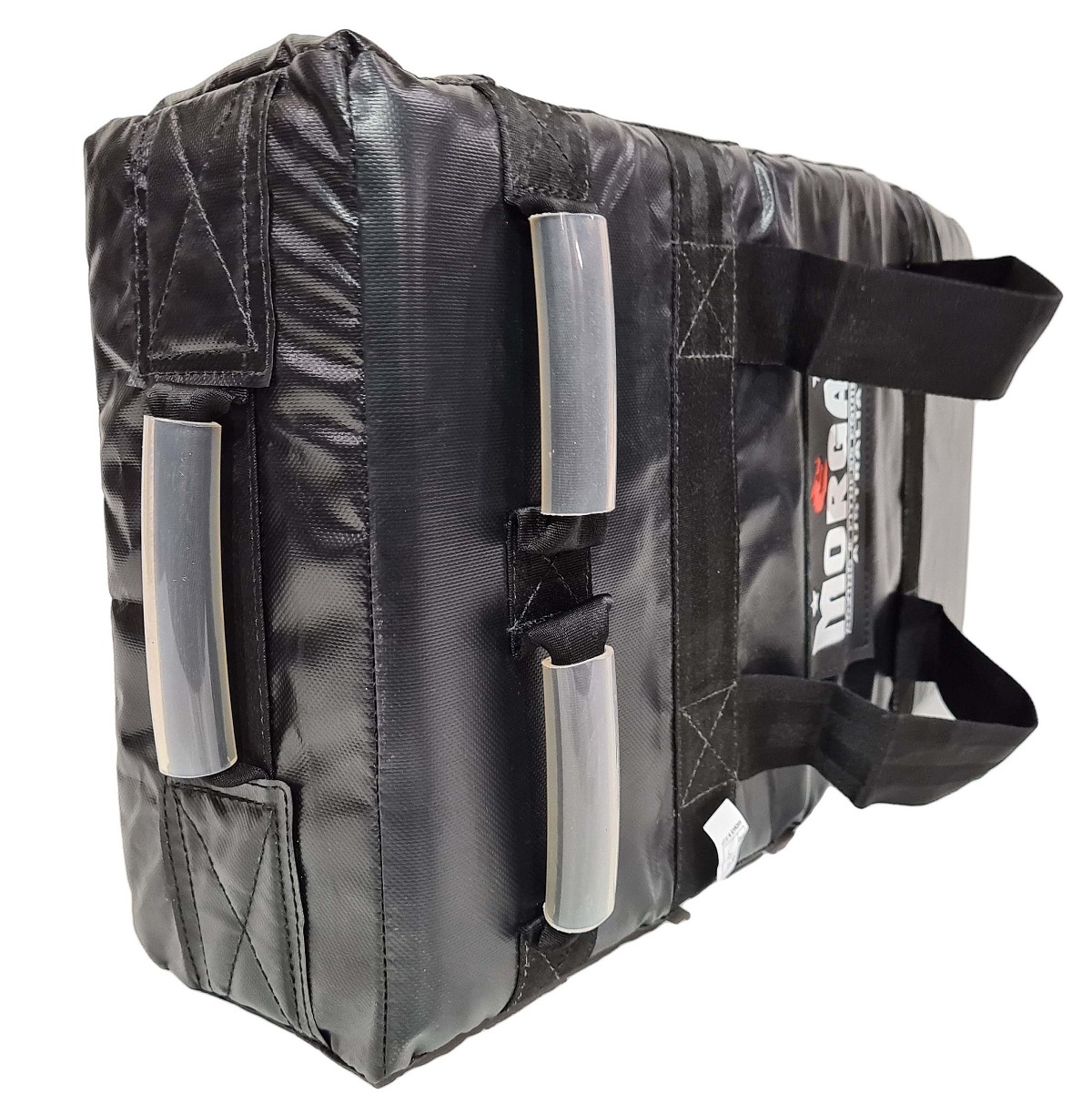 MORGAN COMPETITION EXTRA HEAVY-DUTY, MULTI HANDLE, CURVED STRIKE & HIT SHIELD The Morgan extra heavy-duty competition strike shield is designed for the true combat sports competitor. It is meticulously handcrafted with a technical assemblage using our signature 1000D ripstop vinyl and 17cm high-density Australian-made inner foam. It is also constructed with a high-impact closed-cell protecting foam for impeccable performance and stunning results. The anatomically contoured design and craftsmanship of the four handles placed over the shield allow the trainer full flexibility when coaching. The back handles are offset for the trainer to hold at an ideal forearm positioning and comfort while offering additional handles at the top and bottom of the shield. This further allows seamless transitions to a leg pad and horizontal kick shield perfect for every type of punch, strike, and kicks with this beast. Filled with Australian made closed cell high-density foam 1000D ripstop vinyl 4 strategically located plastic tube handles for seamless drill transitions (1 x top – 2 x rear – 1 x bottom) Air release eyelets x 2 Dimensions: 70 x 35 x 17 (cm)