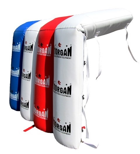 MORGAN ELITE BOXING RING CORNER PADS (4pcs set) Morgan Elite boxing ring corner pads cover both the front and top section of the boxing ring including turnbuckles and corner posts. The corner pads fit easily onto any ring that has 3 or 4 ropes. The foam is designed and constructed to meet AIBA specifications ensuring the corner pads can be used on any type of boxing ring for both club and competition use. Measurements: 1.10m height x 70cm depth (top section) x 35cm width Padding thickness = 20cm high density foam Supplied: 2 x white, 1 x blue, 1 x red = 4pcs 6 x 1.5" webbing straps