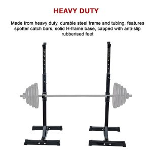 This rack features solid H-frame bases and rubber end caps for stability, catch bars to make life easier for spotters, and an adjustable height that varies from 41 to 66 inches to suit lifters of almost every size. Crafted from high-quality, durable steel tubing, the rack can hold loads up to 200kg. Get serious about your fitness and get your beach body ready for the summer.