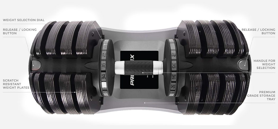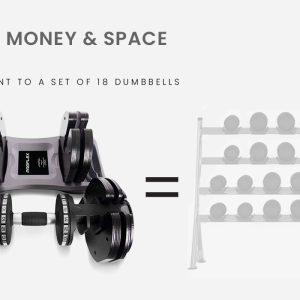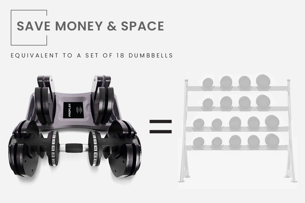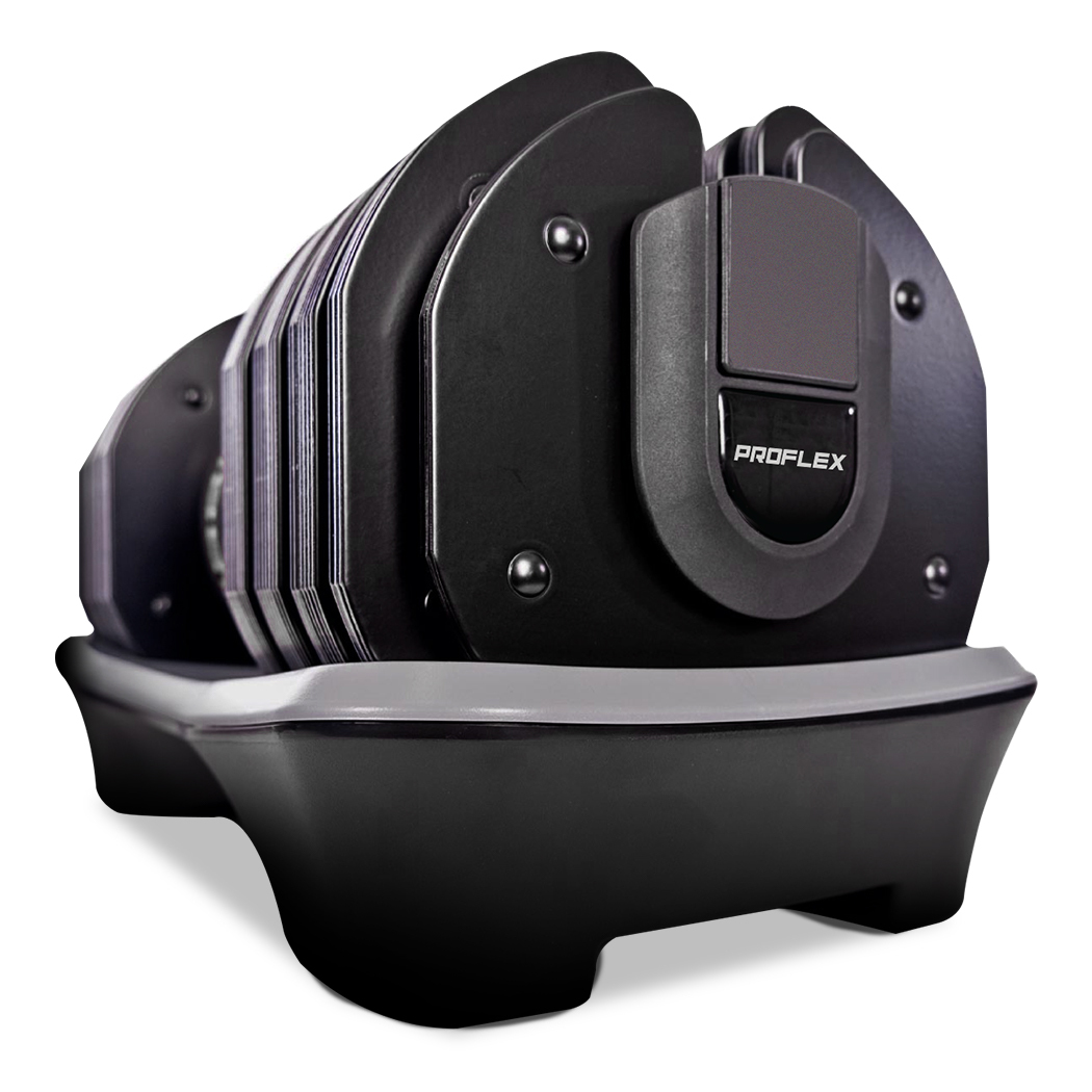 The Proflex 18-in-1 Dumbbell replaces the equivalent of 25 dumbbells, while taking up minimal room and not cluttering your workout space. When you’re done working out, place your dumbbell in the storage dock, without taking up too much floor space.