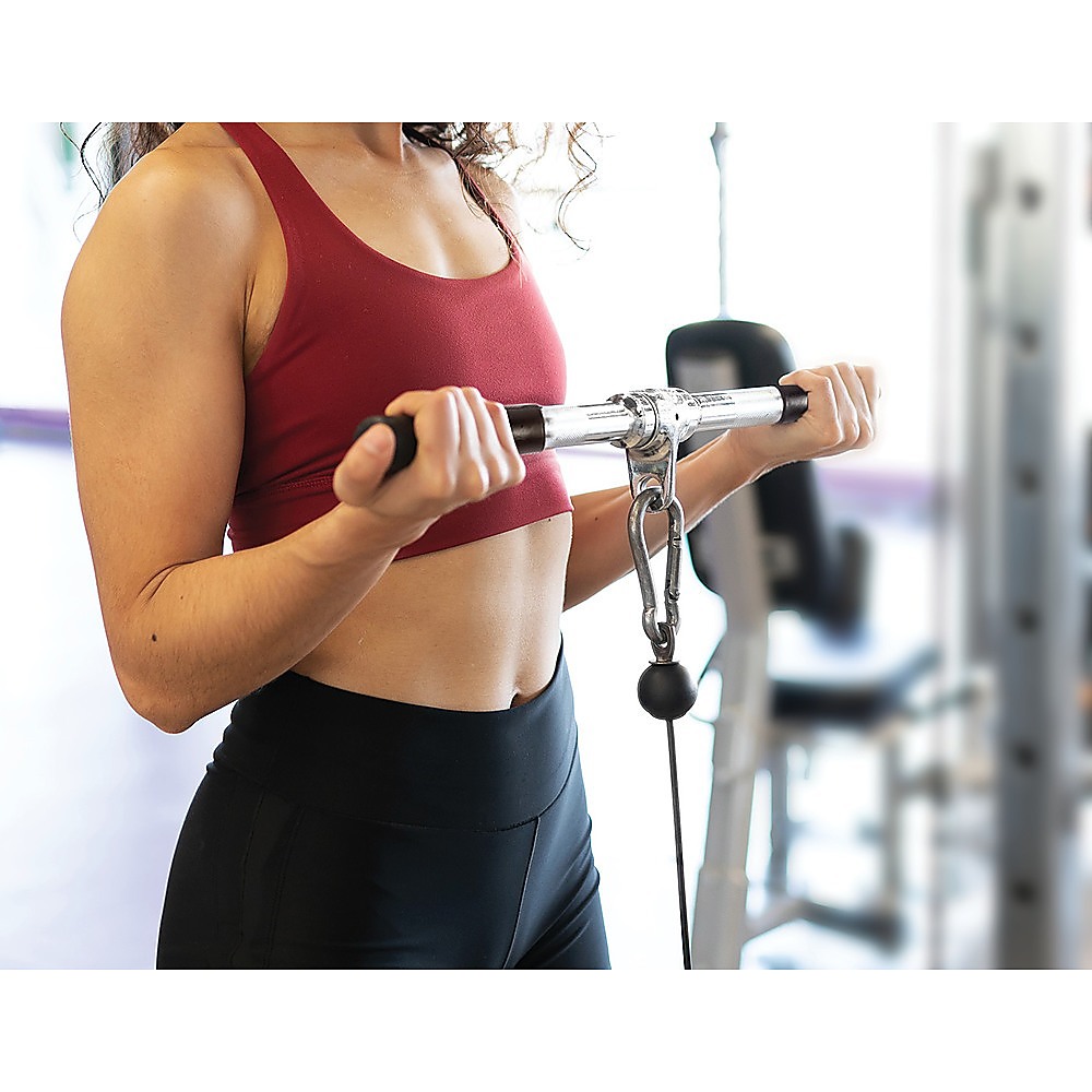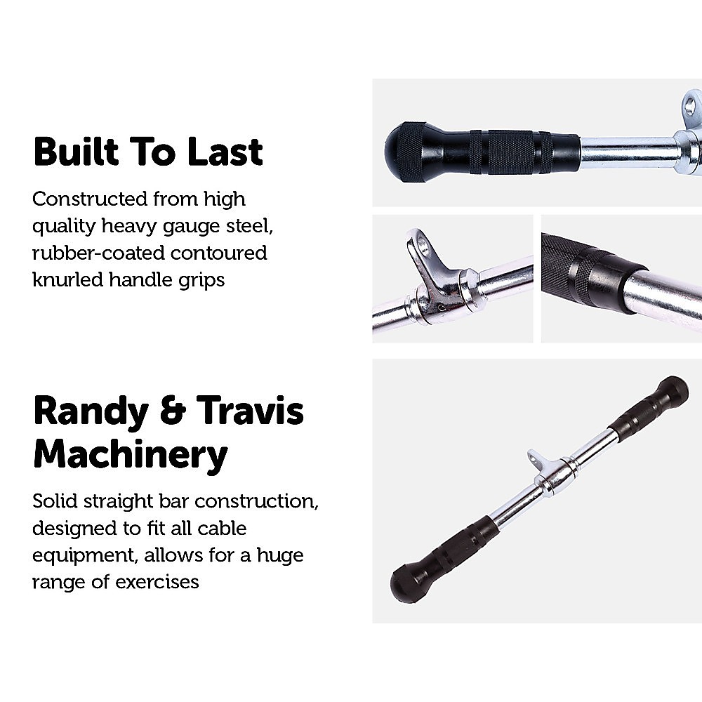 The Randy & Travis Rubber-Coated Straight Bar will allow you to focus on the muscle group that you want to work. This sturdy device will challenge you and provide maximum effectiveness in your workout regimen. This outstanding piece of equipment will allow you to have the most effective and widest variety of cable exercises possible. It will allow you to expand your routine to new levels. This versatile attachment can be used at the home or at the gym.