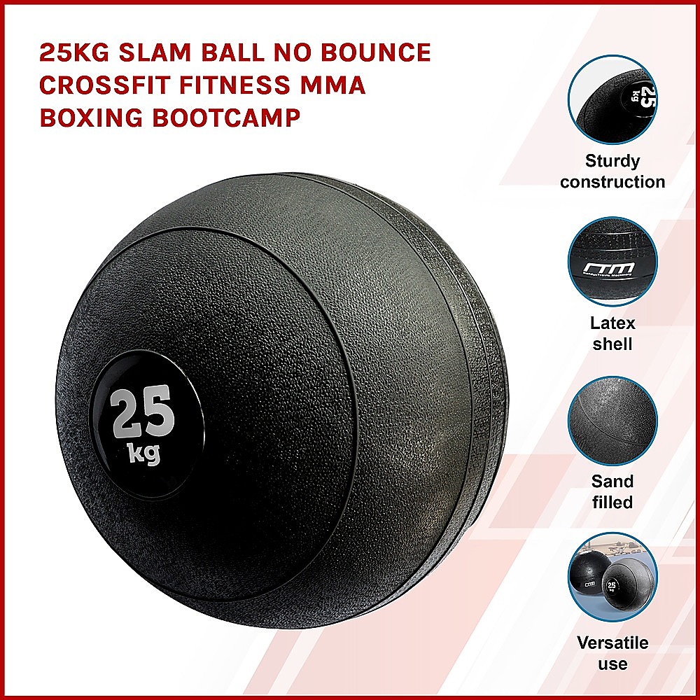 The Slam Ball 25KG offers no-bounce design and is intended for repeated slamming on solid surfaces. Great for CrossFit, MMA, boot camp, ab workout, rehabilitation, and many other exercises. The sand filled inside keeps the ball from bouncing and rolling around during use.