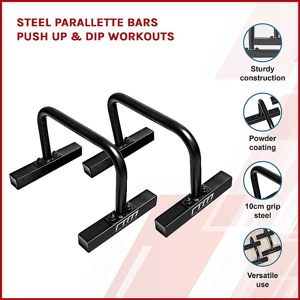 These Steel Parallette Bars are a versatile piece of training equipment. These black powder-coated training aids by Randy & Travis Machinery let you use your own body weight for resistance as you build your core and upper body strength with push-ups, tucks, V-sits, L-sits, dips, and handstands. Ideal for people with a diverse set of abilities, these parallelettes push both beginners and serious athletes to greater heights in performance.